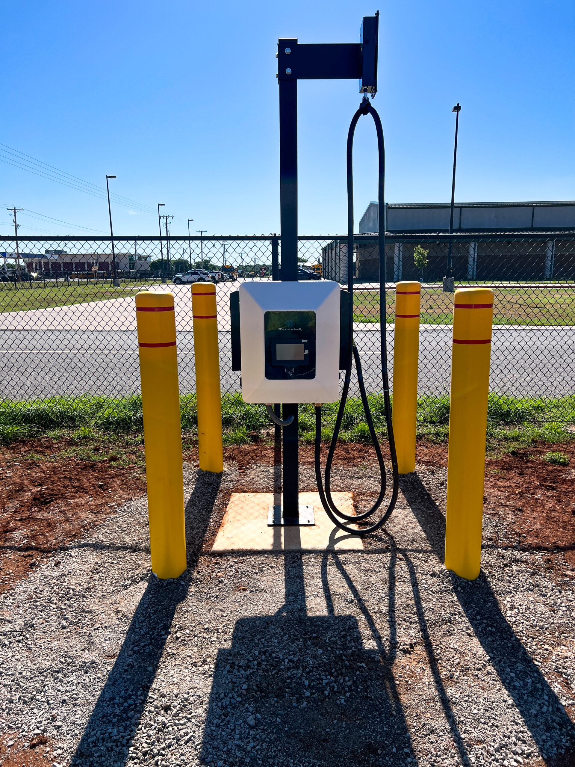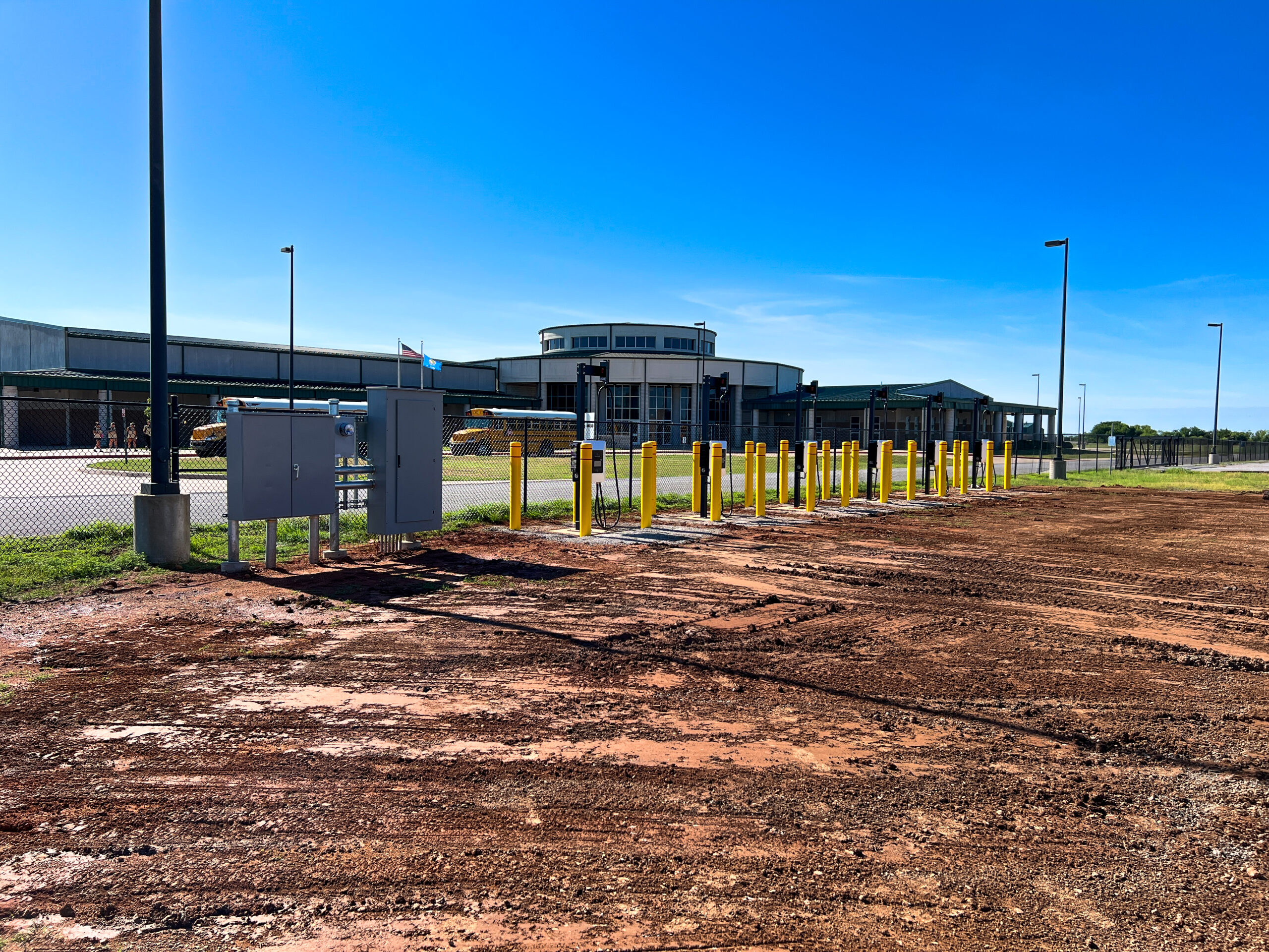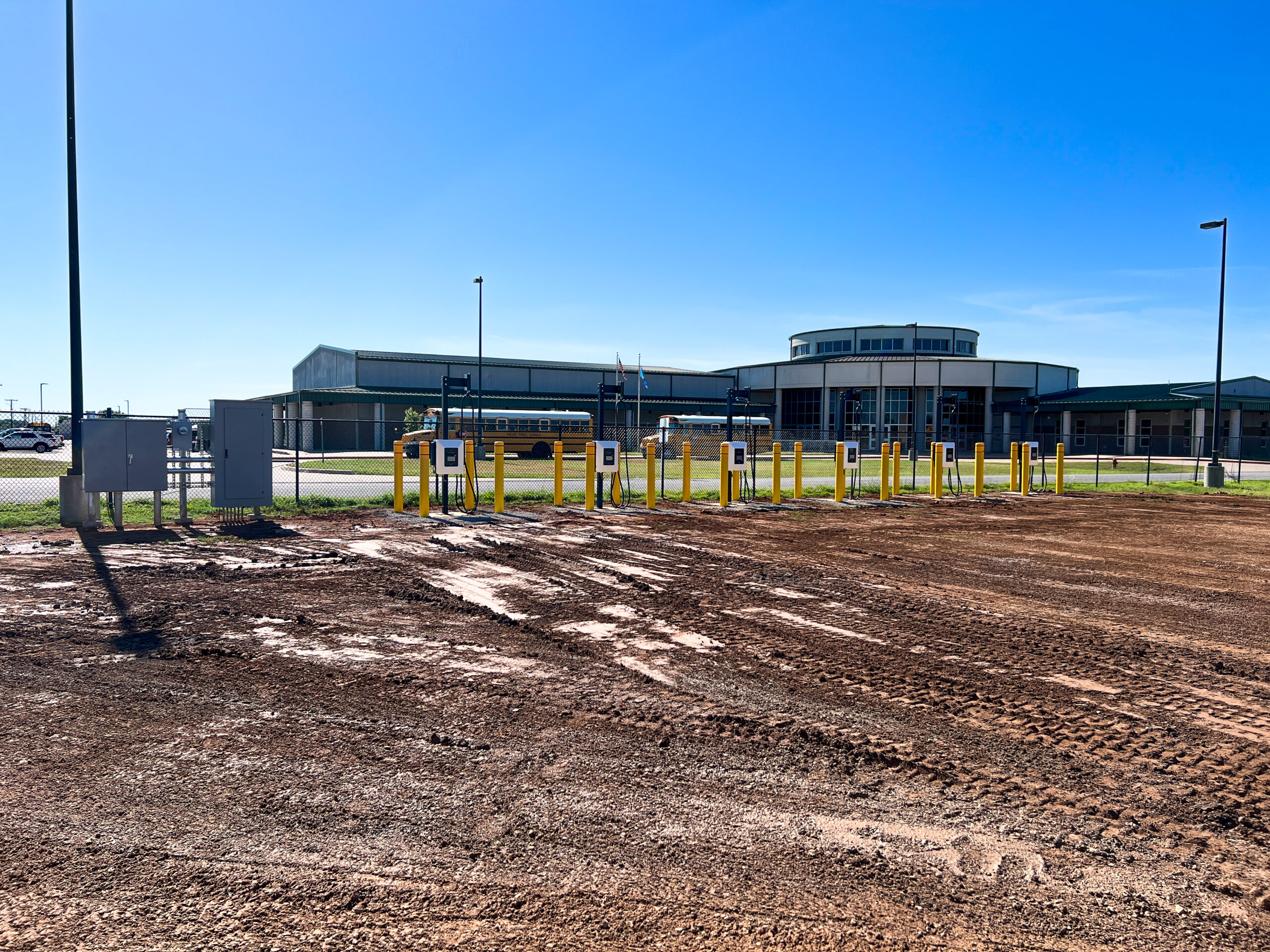 Located in Cache, Oklahoma at the bus maintenance facility, Seaton Construction dug a 115′ x 2′ x 4′ trench for the electrical conduits and poured six 3′ x 3′ x 1’6″ charger pads and three 4′ x 1′ piers for utility, as well as 24 bollards for this project. These charging stations will be utilized by Cache Public Schools for Electric Bus charging, enhancing the facility’s capabilities for sustainable transportation.